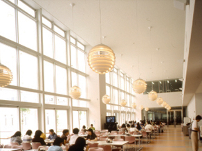 明るく清潔な食堂には200以上の座席がありますが、お昼どきは学生でいっぱいになります。昼以外の時間帯には、自習に利用する学生もいます。