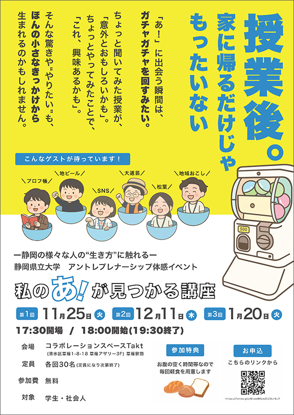 本イベントでは、起業を目指す本学の現役学生や、静岡出身の大学生インフルエンサー、まちづくりに取り組む社会人など、計6名の講師をお招きします。