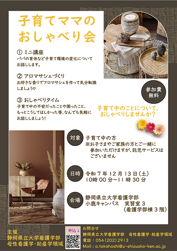 看護学部は子育て中の方を対象に「子育てママのおしゃべり会」を開催します。