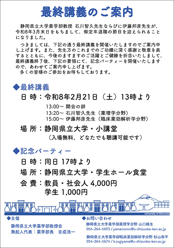 薬学部の石川智久教授ならびに伊藤邦彦教授が、2026年3月末日をもちまして、定年退職の節目を迎えることになりました。つきましては、下記の通り最終講義および記念パーティーを開催いたします。 多くの皆様のご参加をお待ちしております。