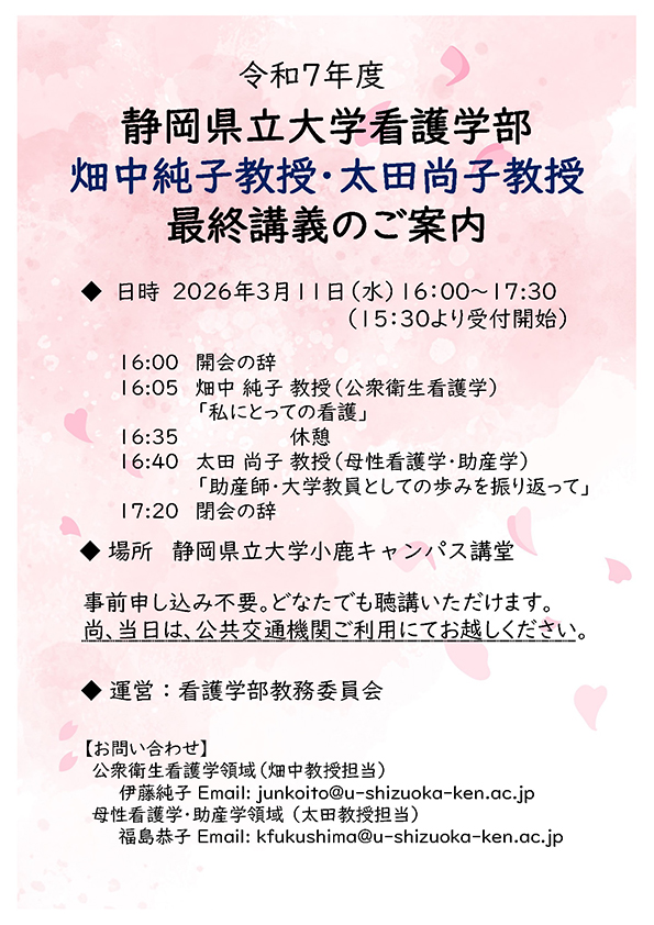 看護学部・大学院看護学研究科の畑中純子教授(公衆衛生看護学)・太田尚子教授(母性看護学・助産学)の最終講義を開催します。多くの皆さまのご参加をお待ちしています。