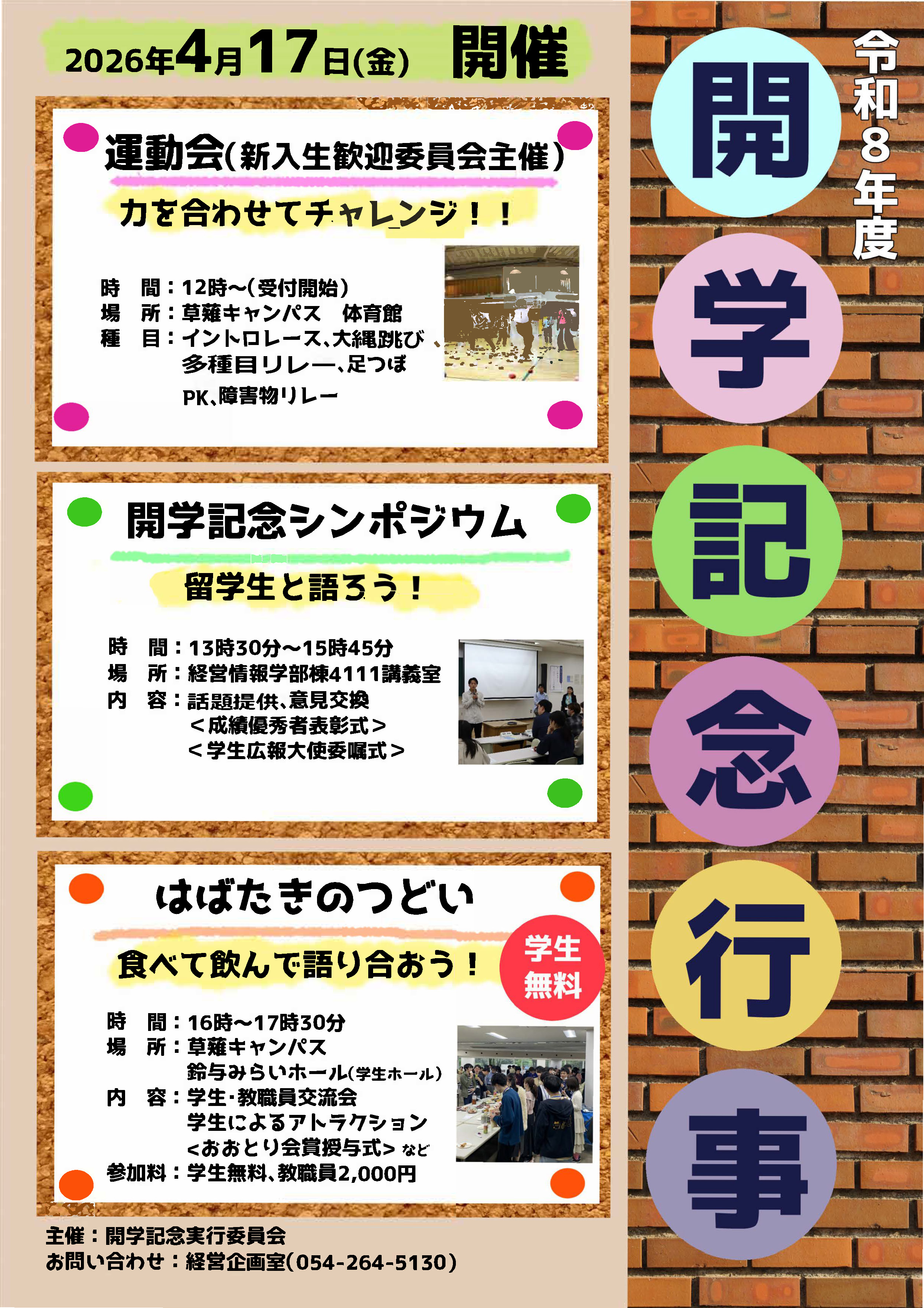 学生・教職員が一堂に会する開学記念行事です。 皆さん、奮ってご参加ください。