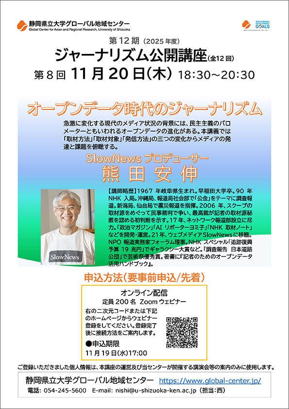 静岡県立大学ジャーナリズム公開講座は令和7年度、全12回の講座を開講します。