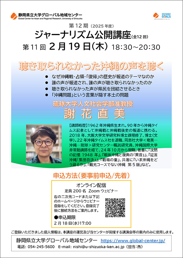 2月19日は、琉球大学人文社会学部准教授の謝花直美(じゃはな なおみ)氏が「聴き取られなかった沖縄の声を聴く」と題して講義します。