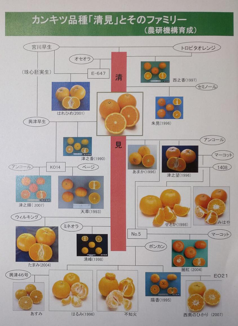 槙の生け垣に囲われた圃場に清見の原木があり、かなり大きくなっている。カンキツ類は普通、人の背丈に合わせて育てるが、原木は別である。清見の原木は、1949年、温州ミカンの「早川早生」に「トロビタ」オレンジを交配して得られた実生を1956年にこの場所に植えたものである。実がなるまでに14年かかった。果実の品質が優良なので1979年6月29日、「清見」と名付けて公表された。清見寺と清見潟に因む命名である。交配から実に30年が経過して生まれた清見の記録である。正式には「清見タンゴール」(別名、清見オレンジ、清見みかん、清見)、品種名「清見 Kiyomi(きよみ)」、系統名「カンキツ興津21号」、命名登録年月日:1979年6月29日、命名登録番号「タンゴール農林1号」である。