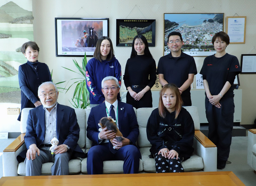 前列左から筆者、深澤町長、柏本理江(きょん)、後列左から尾池葉子、伊澤麗華、有泉香代、佐野勇人、宮原亜砂美。町長の持っているのはきょんちゃんのデザインした、ばんえい競馬の馬、筆者の持っているは同じく帯広空港のシンボル「空(くう)」。