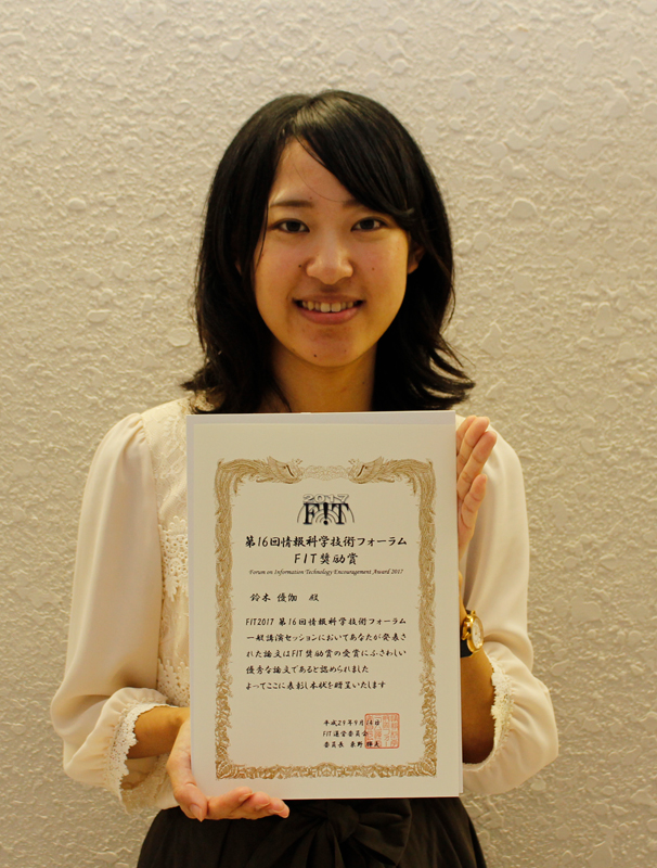 経営情報イノベーション研究科修士課程2年の鈴木優伽さんは、9月12日から14日に東京大学・本郷キャンパスで開催された「FIT2017 第16回情報科学技術フォーラム」において、奨励賞を受賞しました。 論文名:分解型ステップ媒介中心性による道路網分析 著者:鈴木優伽・斉藤和巳(経営情報学部 教授) 奨励賞を受賞した鈴木さん 関連リンク FIT2017 第16回情報科学技術フォーラム 受賞者一覧(掲載予定) (別ウィンドウで「情報処理学会」のウェブサイトが開きます) (2017年10月12日)