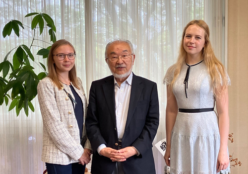 5月19日、本学の国際交流協定校であるモスクワ国立国際関係大学(ロシア)からの交換留学生が、尾池学長を表敬訪問しました。2人は、4月から本学で留学を開始しており、間もなく3カ月の留学期間を終了します。日本語で授業を受講したり、日本人学生や他国の交換留学生とともに国際学生寮で生活したりするなど、留学生活を満喫しているようです。