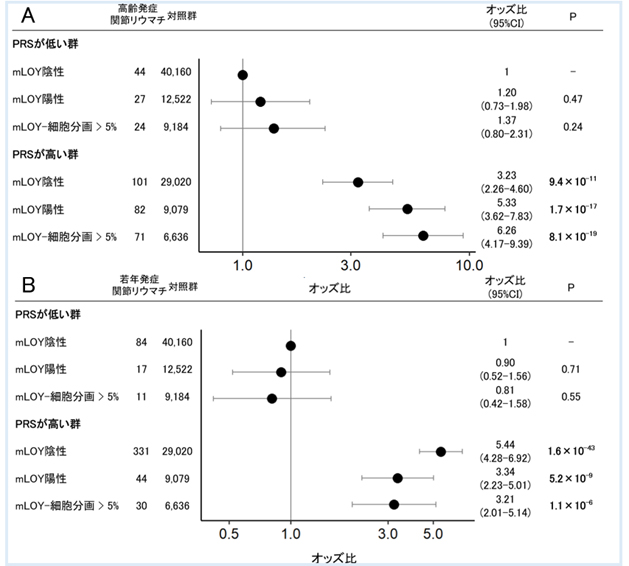LORAは高齢化に伴い増加していますが、詳細な発症要因は分かっていません。今回、国際共同研究グループは、バイオバンク・ジャパン(BBJ)[4]の登録者約18万人と日本のRA前向きコホート[5]であるIORRA[5]のRA患者約2,400人の末梢血DNAから、体細胞モザイクを同定しました。LORAは若年発症関節リウマチ(YORA)と臨床特徴が異なりますが、特に男性の性染色体であるY染色体を喪失した細胞が血中に増加する現象(mLOY)がLORAのリスクの上昇に寄与するのに対し、YORAのリスクを低下させることを明らかにしました。さらに、LORAにおいてmLOYは遺伝要因であるポリジェニックリスクスコア(PRS)[6]と相互作用し、LORAのリスクの上昇と関連することも分かりました。