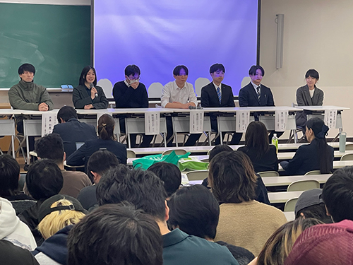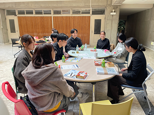 7回にわたり県内企業30社を招いて行った就活ランチでは、企業の採用担当者や卒業生と学生が同じテーブルでランチを共にし、リラックスした雰囲気の中で交流を深めました。企業や仕事について率直な話を聞くことができ、学生にとって就職活動への理解を深める貴重な機会となりました。採用担当者とともに来学した卒業生の中には、卒業後初めて大学を訪れた方も多く、ゼミの指導教員との再会や、学生時代の思い出話に花を咲かせる場面も見られました。