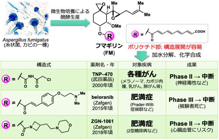 それぞれ別のカビが生産する天然物で、MetAP2を強力に阻害する作用をもつ。赤痢アメーバに高い効果を示す一方、体内で分解されやすいことや副作用の問題から、これまで実用化には至っていなかった。