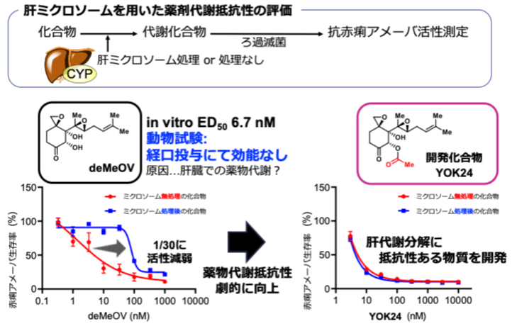 - 本手法により、赤痢アメーバに高活性だが肝臓内で速やかに分解されてしまう天然物「オバリシン注3)」を「分解されにくく安全性の高い」化合物群へ改良した。