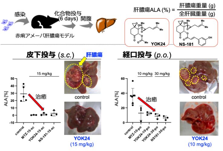 この手法を用いて、研究グループは約30種類の改良版化合物を体系的に設計・合成し、赤痢アメーバに対する高い薬効を維持しながら、動物体内で分解されにくく、毒性が低い候補群を絞り込みました(有機合成化学者の住井裕司准教授との共同研究, 図3.)。さらに、その中から最適化した2種の化合物YOK24 (合成した学生Yuki Okuraより命名)およびNS-181について動物実験を行った結果、ハムスターの赤痢アメーバ肝膿瘍モデルにおいて、皮下注射および経口投与のいずれでも高い治療効果を示し、病変が消失することを確認しました(寄生虫学・生物医化学者の野崎智義教授、中野由美子博士との共同研究, 図4.)。
