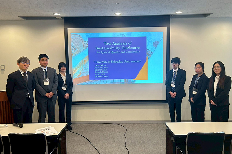 当日、本学からは経営情報学部と経営情報イノベーション研究科の合同チームが、「Text Analysis of Sustainability Disclosure」と題した研究成果を英語で発表しました。近年の投資家行動の変化や国際的な基準策定を背景に、上場企業に義務化されたサステナビリティ情報開示について報告し、Pythonを用いたテキスト分析により、業界ごとの開示内容の差異や企業の開示態度に関する分析結果を提示しました。