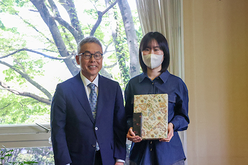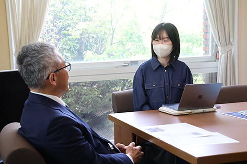 4月22日、内閣府「日本・韓国青年親善交流事業」(2025年度)の日本青年代表として派遣された、経営情報学部3年の橘田実知さんが、今井康之学長に活動報告を行いました。